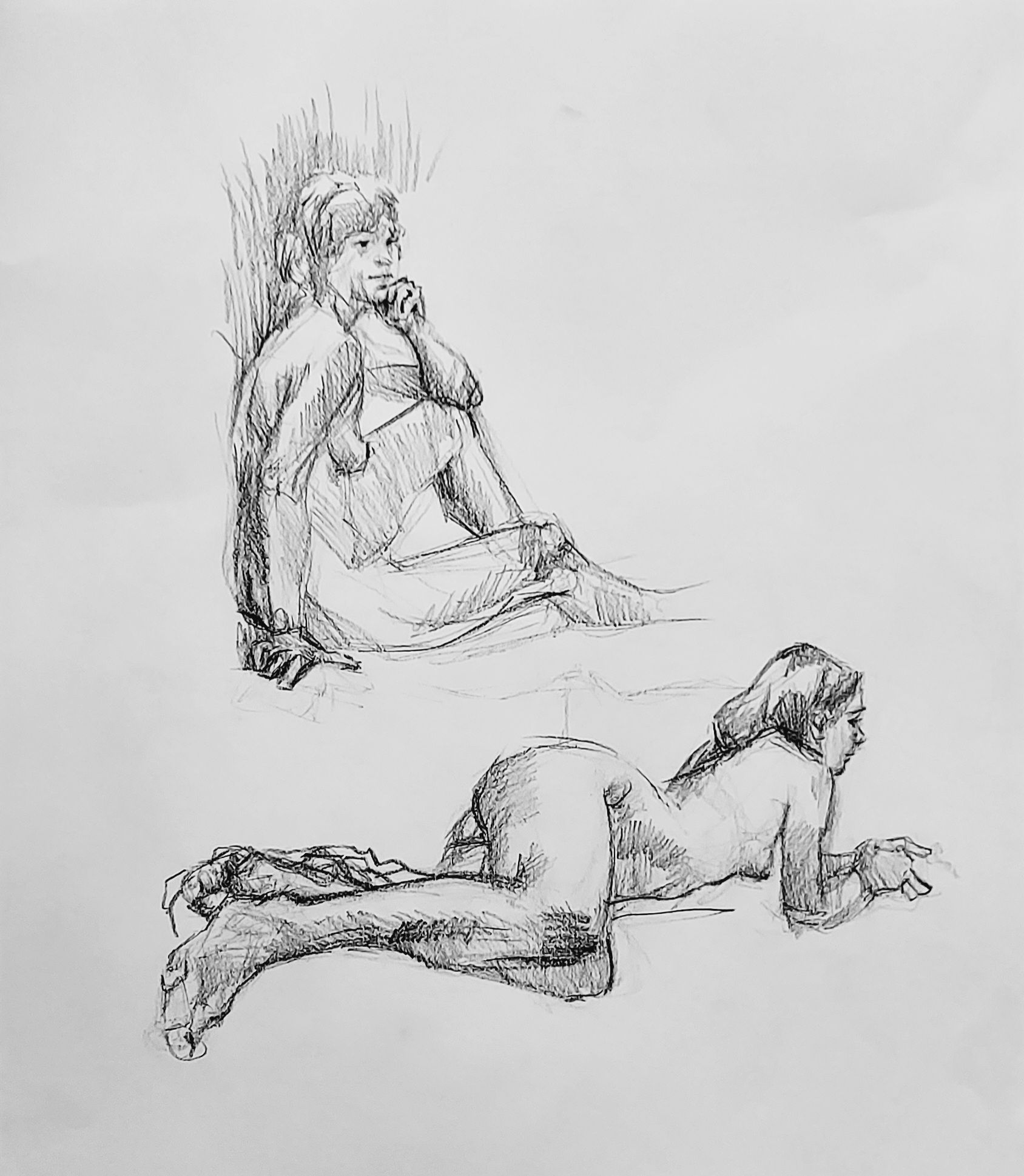 In der zweiten Kurshälfte zeichnen wir nach einem Live-Modell. Jeder Teilnehmerin übernimmt im Verlauf des Kurses einmal selbst die Modellposition.